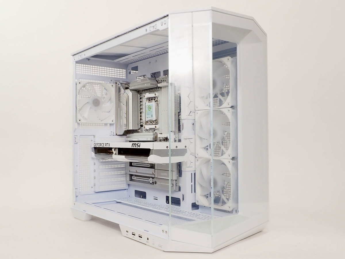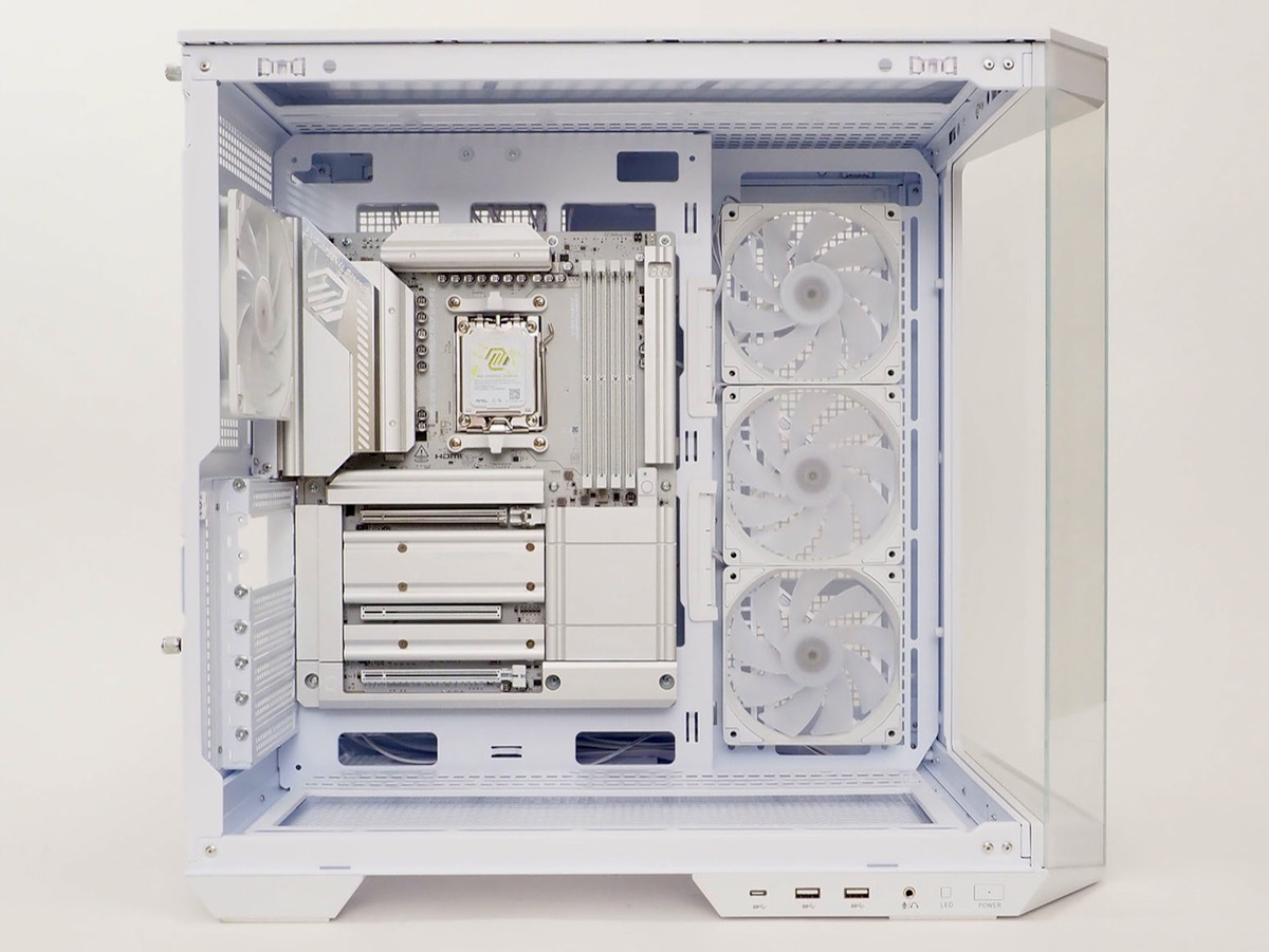 次は背面コネクタ対応ケース。MSIの「MAG PANO 100R PZ WHITE」と合わせてみた。左右非対称デザインのピラーレスケースで、前面の突き出た部分の底にもLED装飾がある。また、台座部分には机の上に置いた時に使いやすいフロントインターフェースが設けられている。冷却では側面、底面、天面が12cm角ファン×3基(360)対応で背面にも12cm角ファン×1基対応。側面3基と背面1基が標準ファンとして搭載済みだ。