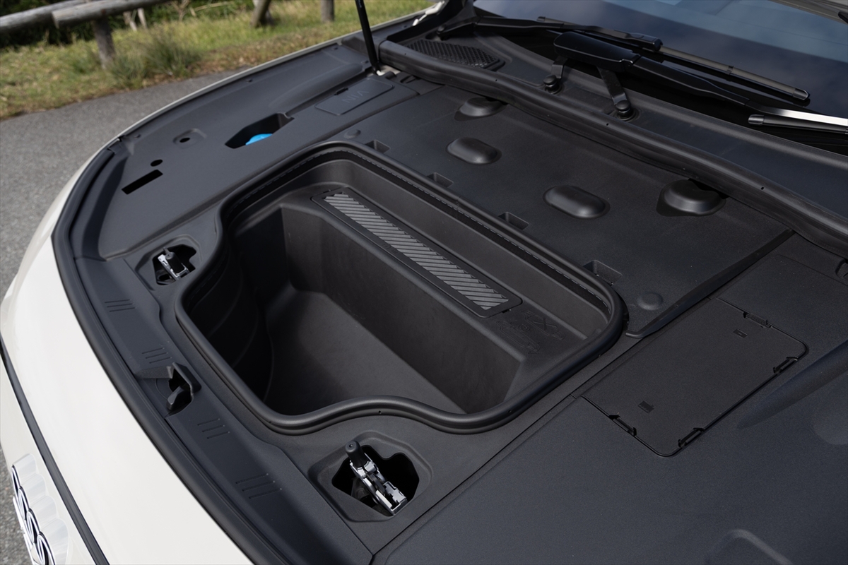 モーターを確認しようとフロントボンネットを開けると、そこにあるのは収納スペース。普通充電の電源ケーブルを収納するのに便利です。