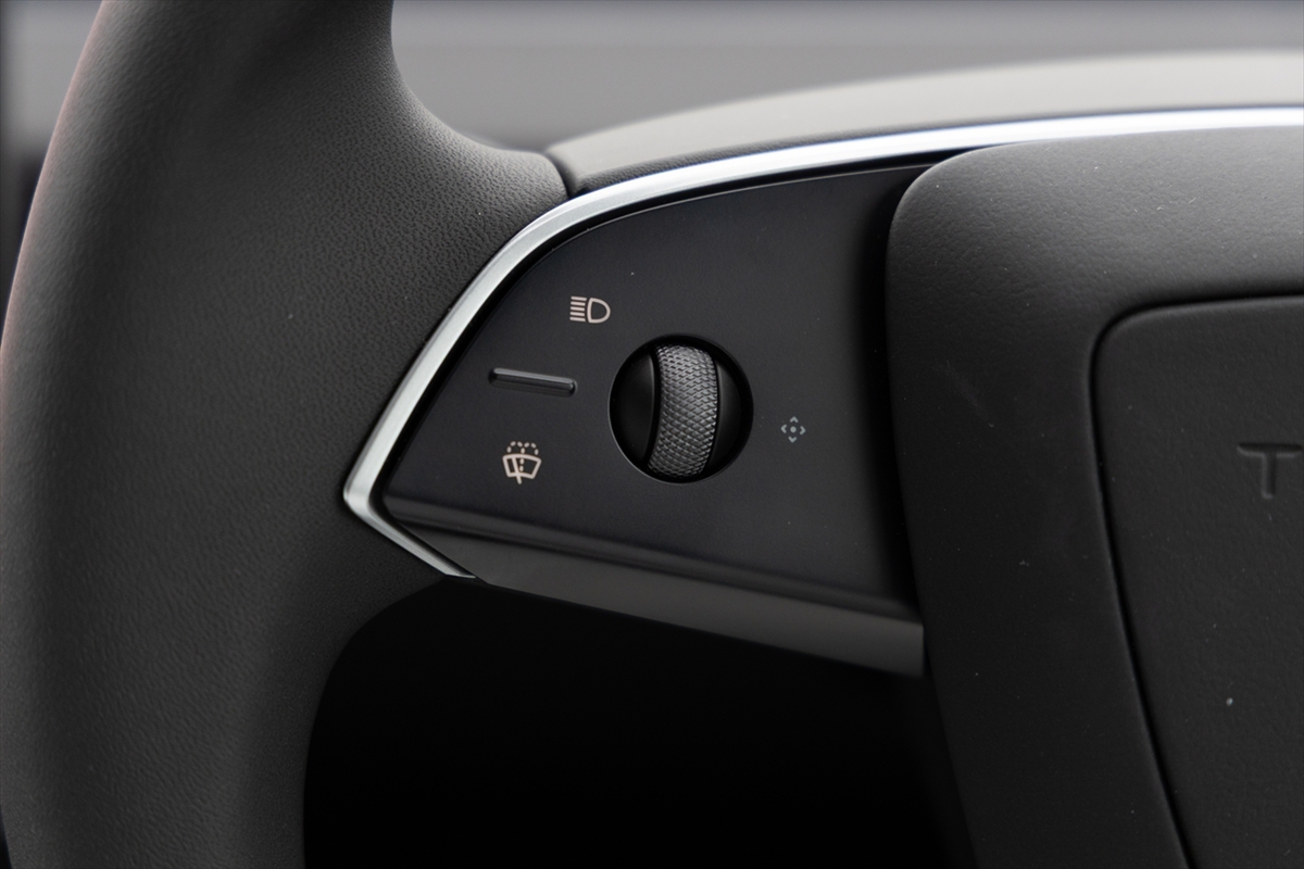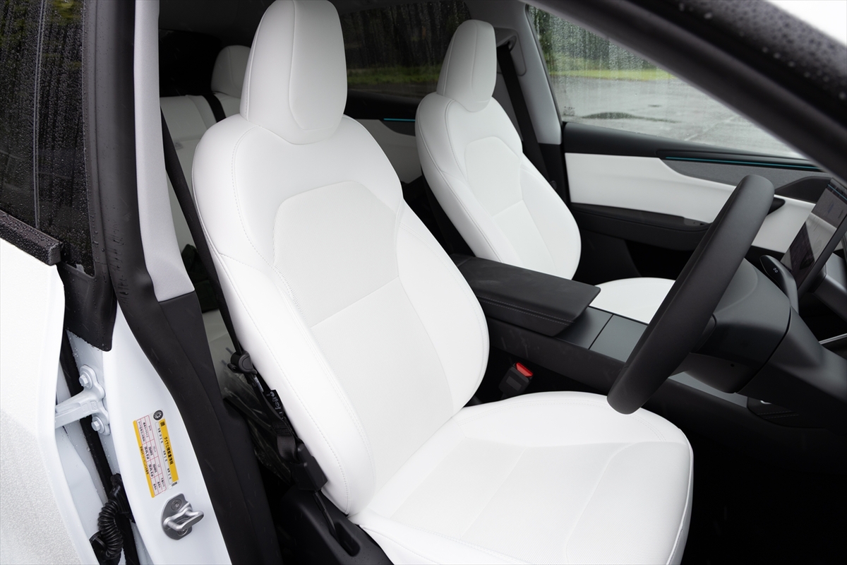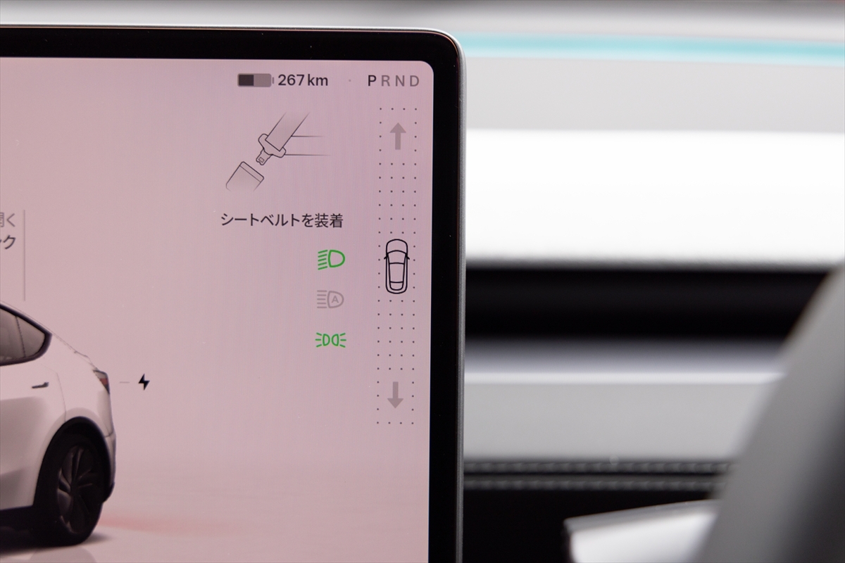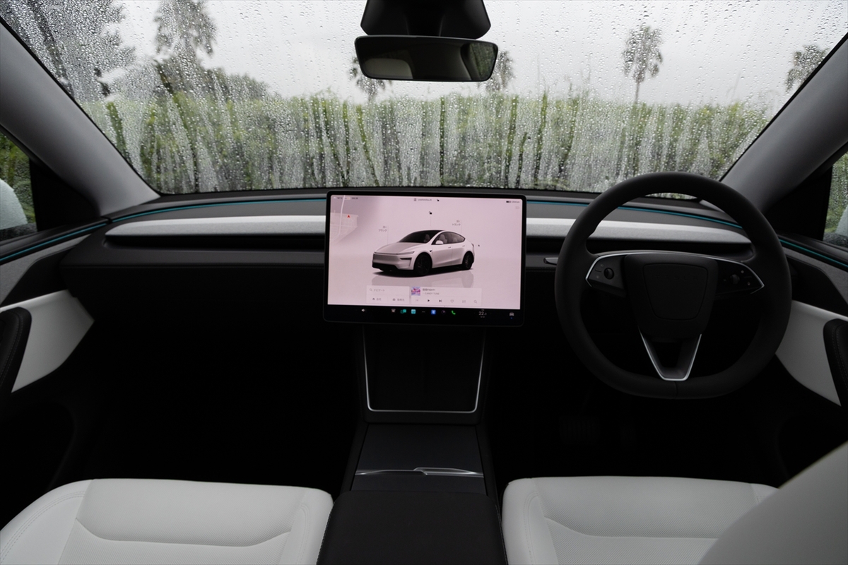 車内を眺めてみるとハンドルのほか、中央に15.4インチのタッチパネルディスプレイのみ。物理的なボタンやスイッチが極力排除されて、ステアリングホイールまわりに少しある程度というミニマリズムの極みそのもの。