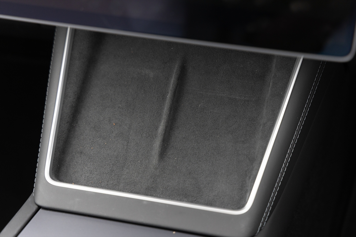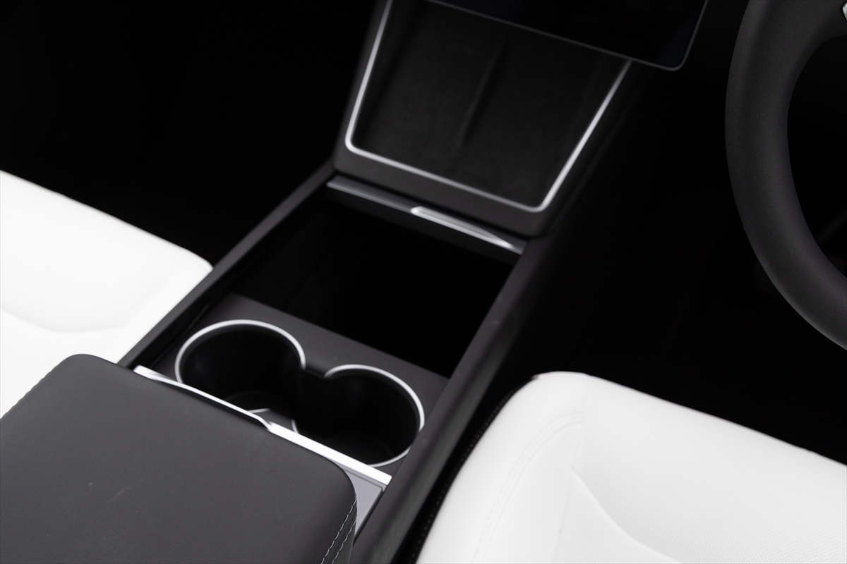 Apple CarPlayなどが一切対応していないのもテスラの特徴。それどころかスマホと車両をケーブルで接続する機能すらない! センターコンソールのアームレストを開けるとUSB Type-Cの端子が見えますが、それはあくまでスマホの充電用。このあたりにテスラの自社ソフトに対する自信を感じました。