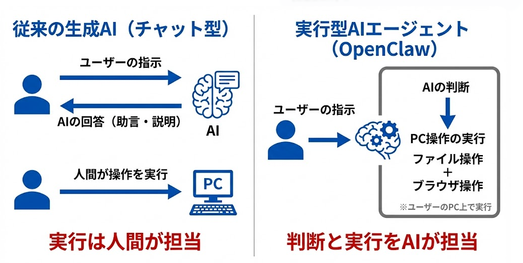OpenClawは、ClaudeやGPT-4oといった大規模言語モデルを「脳」として使いながら、ユーザーのPCに接続し、ファイル操作やコマンド実行を実際に行なう。従来のチャット型生成AIが、テキストで助言するところまでにとどまっていたのに対し、操作そのものを任せられる点が大きな違いだ。