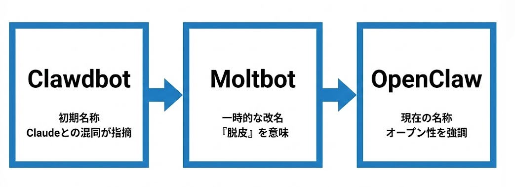 名称は短期間のうちに二度変更されている。初期のClawdbotはAnthropicの「Claude」と混同されやすく、商標上の懸念が指摘された。そこで一度、「脱皮(Molt)」を意味するMoltbotに改名したが、2026年1月末にはさらにOpenClawへと変わっている。開発者によれば、語感の問題に加え、プロジェクトの「Open」な姿勢をより明確にする狙いがあるという。