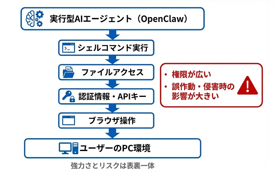 OpenClawに向けられる最大の批判は、その強力さと切り離せないリスクにある。設計上、OpenClawはローカル環境でシェルコマンド(PCを直接操作する命令)を実行できるため、非常に高い自由度を持つ。その一方で、扱える権限は極めて広く、侵害や誤作動が起きた場合には、PC内のファイルや保存された認証情報、APIキー(外部サービスを利用するための鍵)にまで一気にアクセスされる可能性がある。