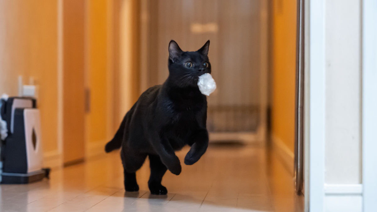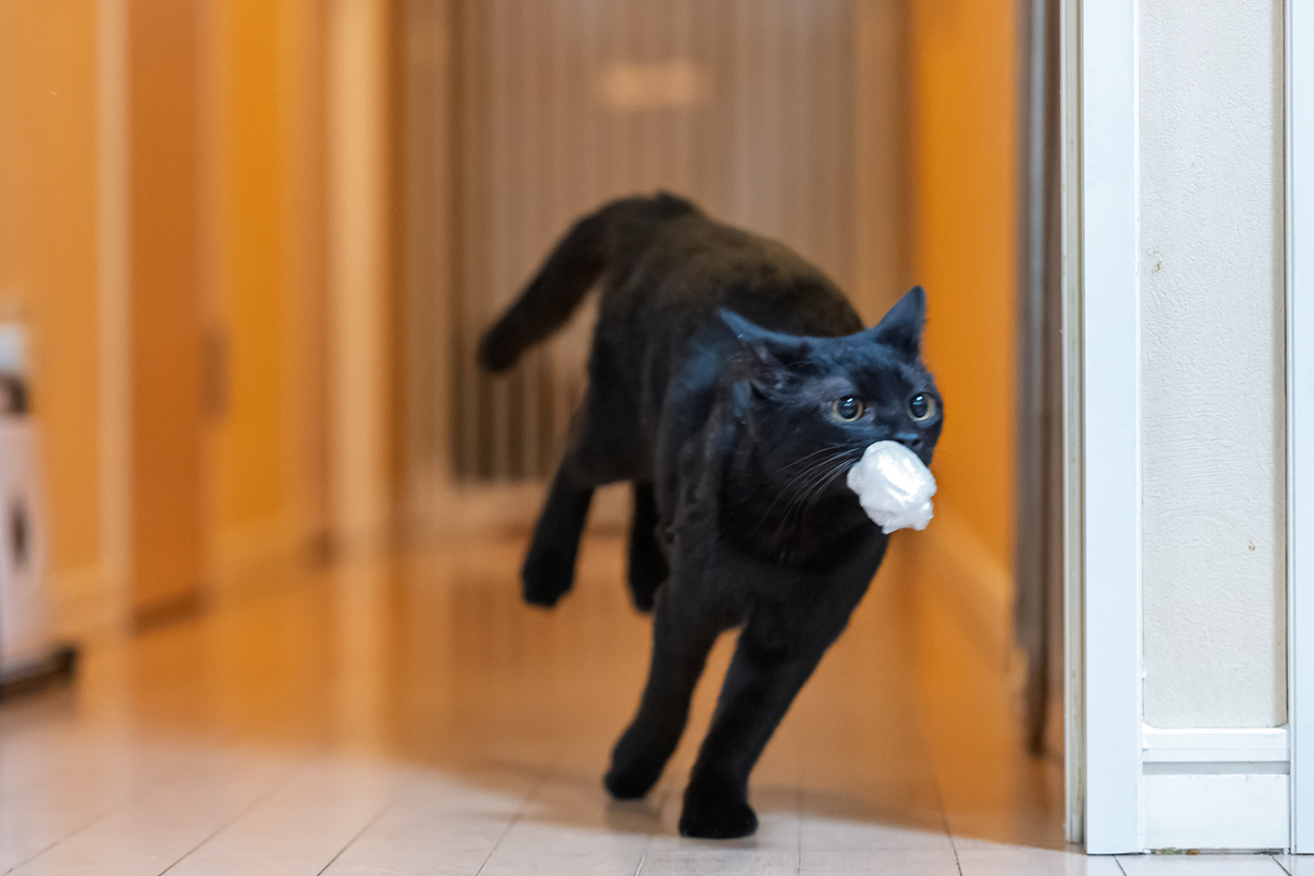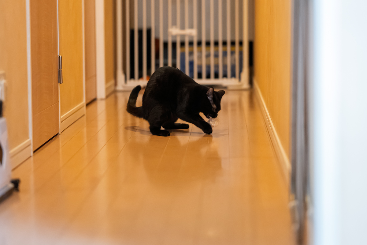 では、このカメラはあめの超高速ダッシュについてこられるのか。菓子やパンが入っていた袋をきゅっと丸めたものがお気に入りなので(実質、コストゼロの猫おもちゃ)、これをリビングから廊下に投げてやる。すると全力でかけていって捕まえるのである。容赦なく全力ダッシュするのだ。
