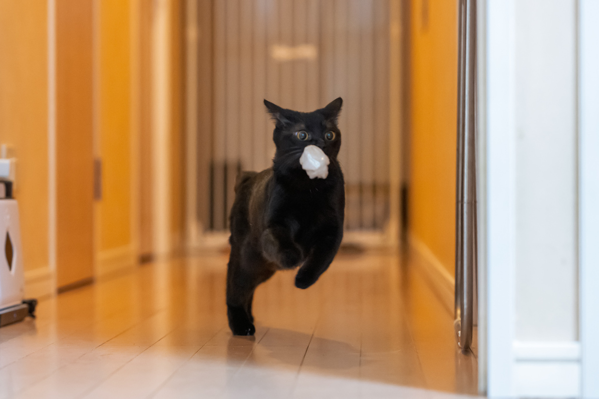 冒頭写真もその1枚。決して明るくはない廊下を全力でかけてくる黒猫にピントを合わせ続けて、連写しろと言われるカメラも大変である。