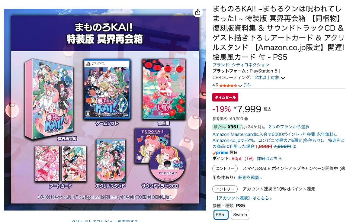 PS5の参考価格は9,900円ですが、今なら19%オフの7,999円でAmazonから購入できます。なお、Switch版は、過去価格7,582円のところ、10%オフの6,817円です。