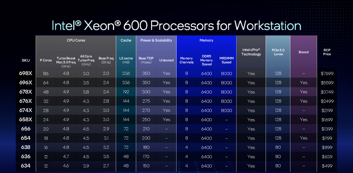 Xeon 600プロセッサーは11モデルあります。製品型番は上から順に、Xeon 698X、Xeon 696X、Xeon 678X、Xeon 676X、Xeon 674X、Xeon 658X、Xeon 656、Xeon 654、Xeon 638、Xeon 636、Xeon 634。
