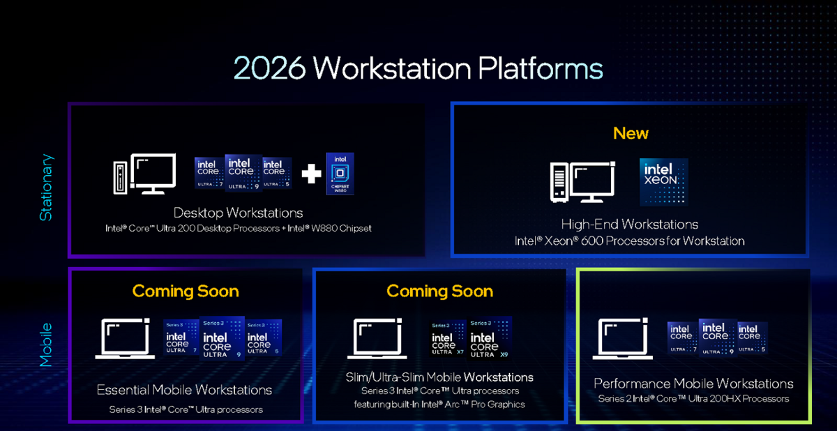 なお、モバイルワークステーション向けでは、今年中にCore Ultraシリーズ3にSKUが追加されそうです。ワークステーションの用途はCAD設計、3DCG制作、高精細動画編集、大規模データ解析、AIディープラーニングとさまざまです。しっかり目的に沿ったマシンを選びましょう。