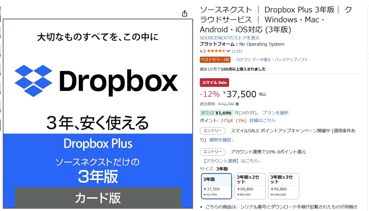 容量や機能だけでなく、継続して使ううえでの運用のしやすさも意外と重要です。3年分をまとめて導入できると、更新忘れや支払い管理の手間が減り、長期利用がよりシンプルになります。普段からDropboxを使っている方ほど、こうした“続けやすさ”の面も含めて検討してみてください。