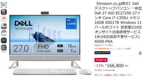 Dellの27インチ一体型デスクトップPC「Dell 27 AIO EC27250」が、Amazonのタイムセール対象になっています。参考価格186,800円のところ、11%オフの166,800円で販売中です。