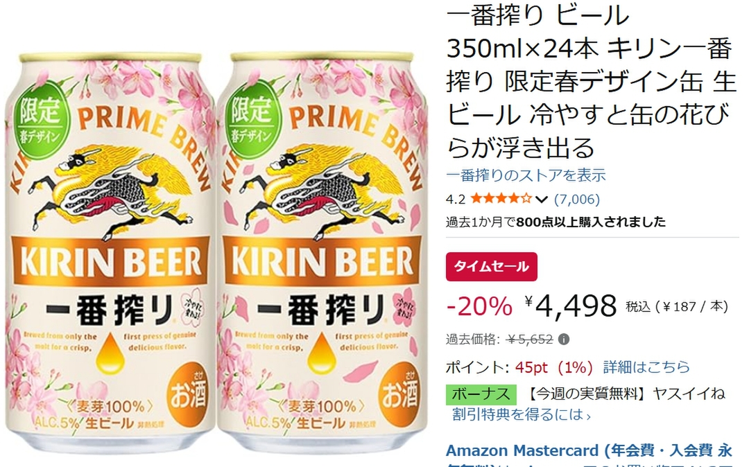 「キリン一番搾り 350ml×24本 限定春デザイン缶」がAmazonタイムセールの対象となっています。