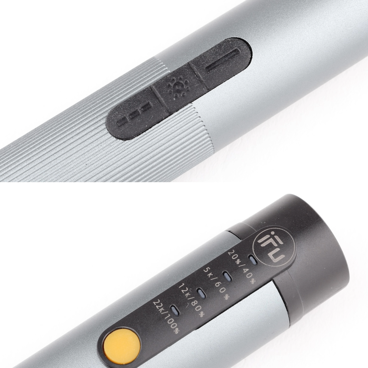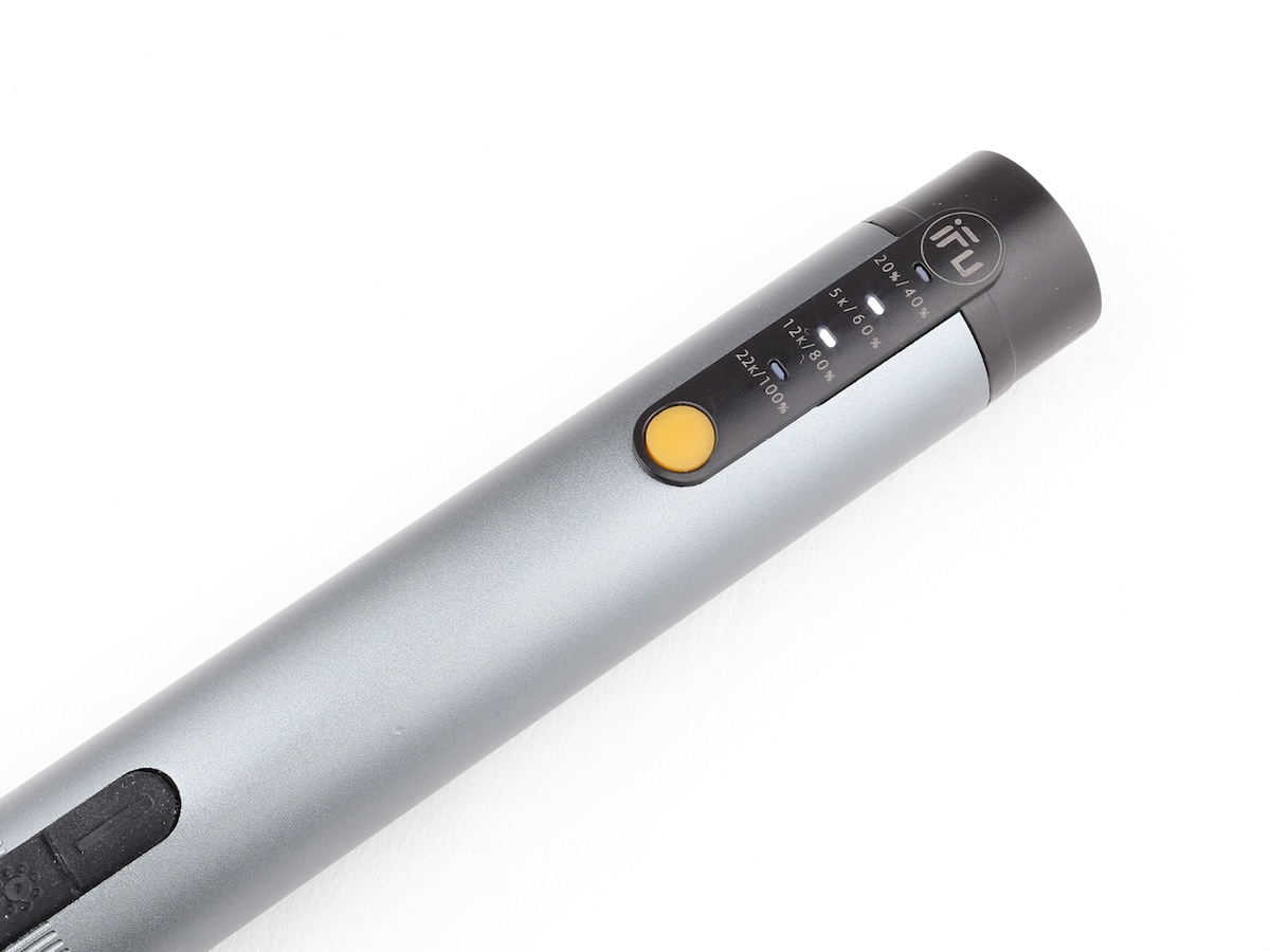 回転数は、末端寄りのセッティングボタンで行ないます。ボタンを押すたびに回転数が5000rpm、12000rpm、22000rpmと変化。白く光るLEDの数で、回転数が分かるようになっています。