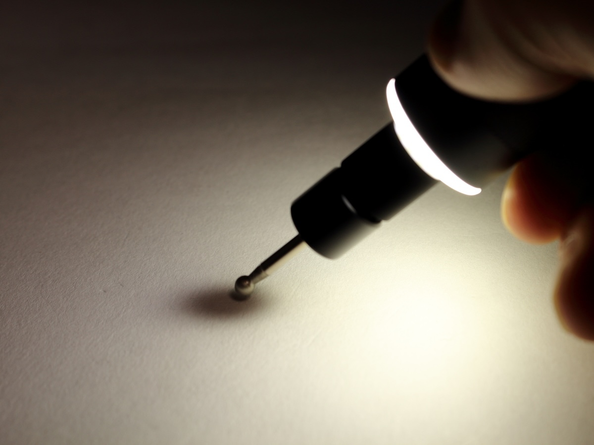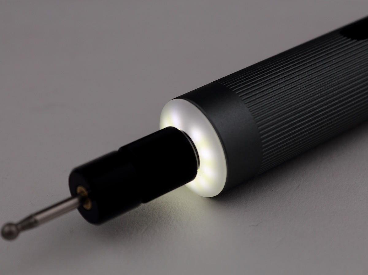 先端のライトは、ライトボタンを押すたびに明るさが3段階に変化。リング状に配置されているため、本体の向きによらず同じように照らせます。