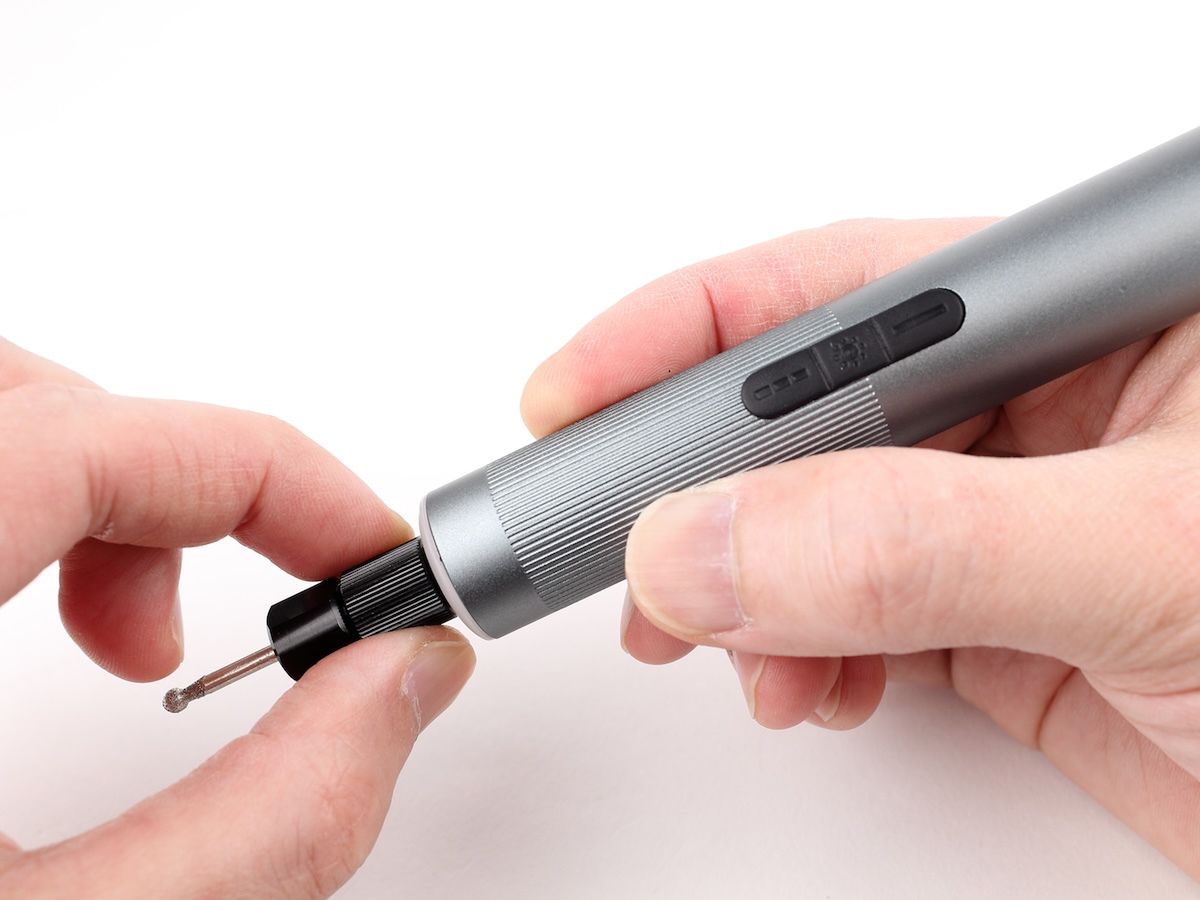 少し使って気がついたのは、回転数が低いとトルクも弱く、ちょっと押し付ける力を強くするだけで簡単に止まってしまうこと。最大回転数だとそこそこ強くなりますが、それでも指2本で止まる程度なので、パワーはあまり期待しない方がいいでしょう。強い力をかけてゴリゴリ削るのではなく、あくまで、高回転するビットで少しずつ削り取っていく、というのが基本です。