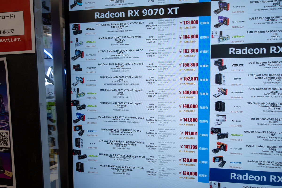 GeForce RTX 5070/5070 Ti/5080搭載ビデオカードは、さらなる価格上昇の可能性や、不透明な入荷状況といった不安がある。一方、AMD Radeon RX 9000シリーズは、ある程度ショップに在庫があり、秋葉原では週末特価品として並ぶこともある。