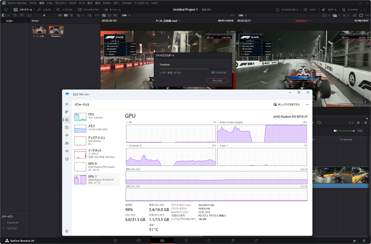 【最新パーツ性能チェック】のレビュー(第462回、第464回)でも分かるように、AI画像生成などRadeon RX 9070 XTが弱い部分もある。ただ、RX 9070 XTはH.264/HEVC/AV1をサポートするデュアルエンコーダーを搭載するなど、動画編集や録画配信に困ることのない性能を備えている。