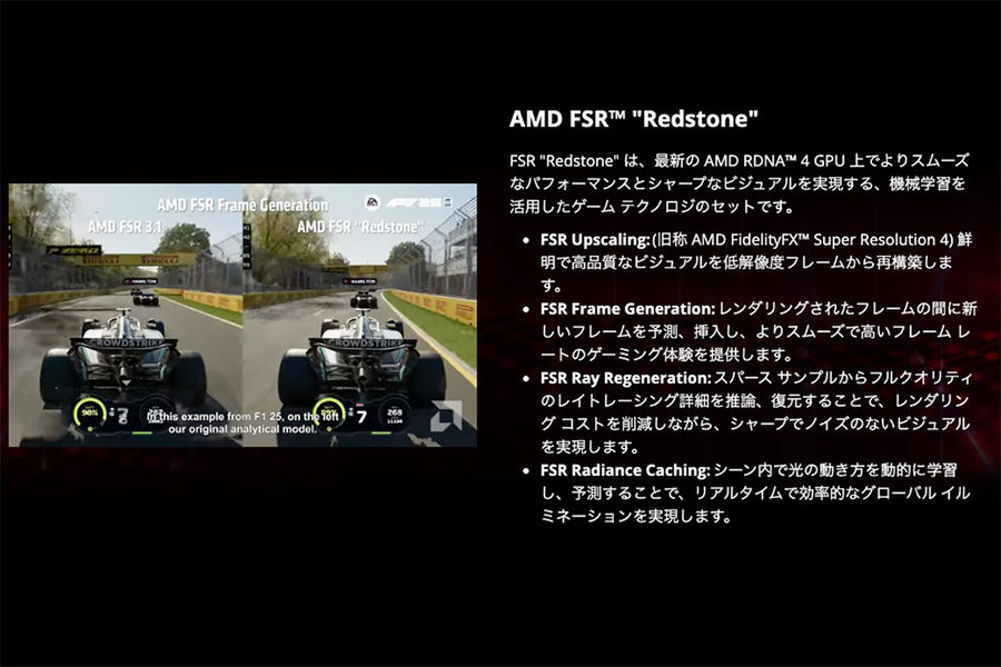 AMDが2025年末に投入した新世代の高画質技術「AMD FSR “Redstone”」も、Radeon RX 9000シリーズ推しのポイントになる。画質向上技術の最新バージョンで、RDNA 4アーキテクチャーGPUで実行可能な機械学習(Machine Learning/ML)を取り入れた新世代の高画質技術となっている。