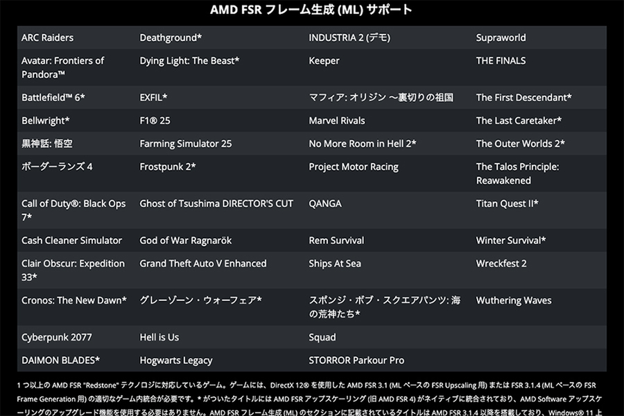 対応するゲームタイトルはまだ少ないが、「F1 25」のように画質が向上し、フレーム生成のゴーストが減少するゲームタイトルもある。FSRは着々と進化しているので、対応ゲームの増加が楽しみだ。