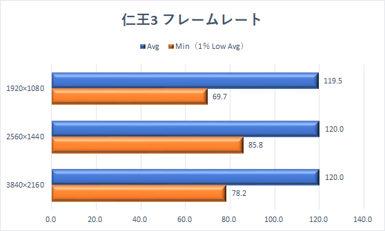 アップスケーリング、フレーム生成を効かせた状態だが、Avgはフレームレート上限の120fpsに達し、プレイ感に影響するMin(1% Low Avg)も60fps超えを維持できている。