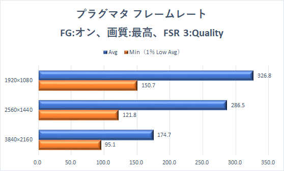 グラフィック品質は各項目で最高品質になるように選択し、レイトレーシング:オン、アップスケーリングをFSR:Quality(クオリティ)、フレーム生成はオフとオンの両方に設定してプレイしてみた。「CapFrameX v1.8.3」を使用し、一定ルート移動した際(60秒間)のフレームレートを記録した。