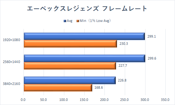 4K解像度は「エーペックスレジェンズ」のフレームレート上限となる300fpsには届かなかったが、そのほかはAvgが300fspに達し、Min(1% Low Avg)も200fps超えを記録している。画質設定を下げることで、リフレッシュレート240Hz張り付きプレイを十分狙っていける。