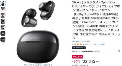 Shokzのイヤーカフ型ワイヤレスイヤホン「OpenDots ONE」が、Amazonのタイムセール対象になっています。参考価格27,880円のところ、20%オフの22,345円で販売されています。