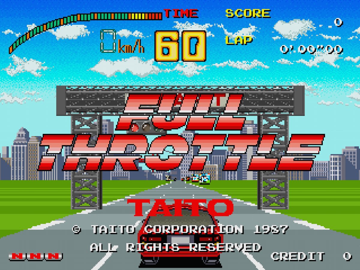 『フルスロットル』は、1987年にタイトーから発売されたレースゲーム。いかに早く目的地へ到着できるかを競う街道レースに参加し、障害物や敵車との衝突を避けながらゴールを目指すことがゲームの目標だ。