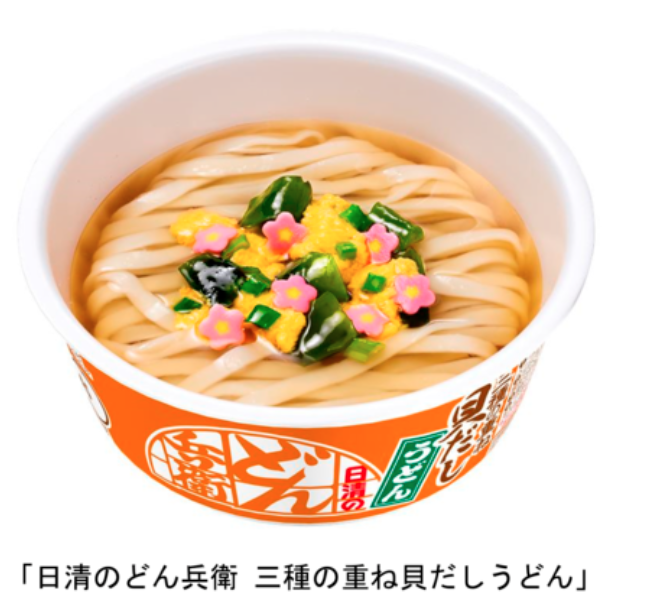 「日清のどん兵衛 三種の重ね貝だしうどん」は、春が旬のあさりとはまぐりのうまみに、ほたてのコクをぜいたくに重ねた、濃厚で上品な味わいのつゆが特長の商品。具材は花形かまぼこ、かきたま、ワカメ、ネギ。