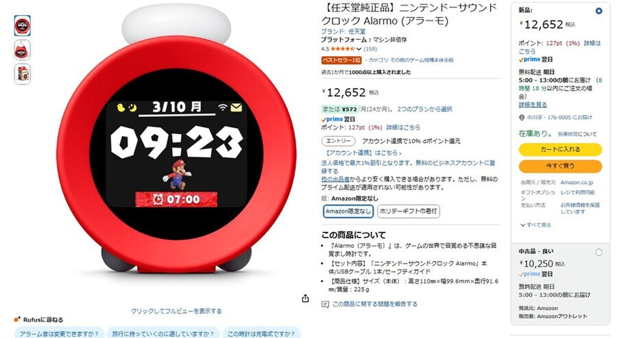 Amazon.co.jpにて、ニンテンドーサウンドクロック 「Alarmo(アラーモ)」が販売中だ。価格は1万2652円。