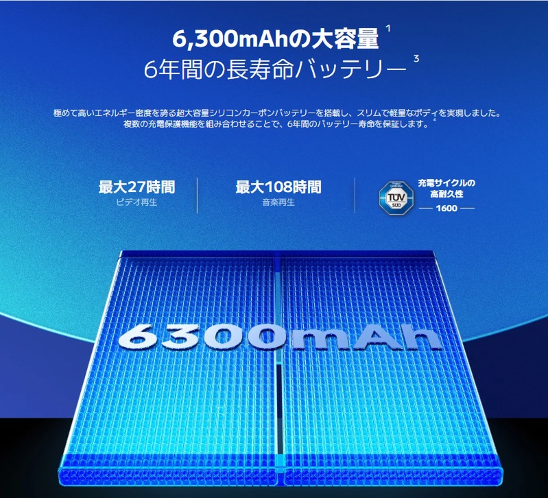 さらにすごいのは、バッテリーの「寿命」です。新しい技術を採用することで、6年間(1600回の充電サイクル)使っても80%の容量を確保できるとしています。スマホを長く使っていると、だんだん電池持ちが悪くなってくるのが悩みどころですが、そのストレスから解放されます。