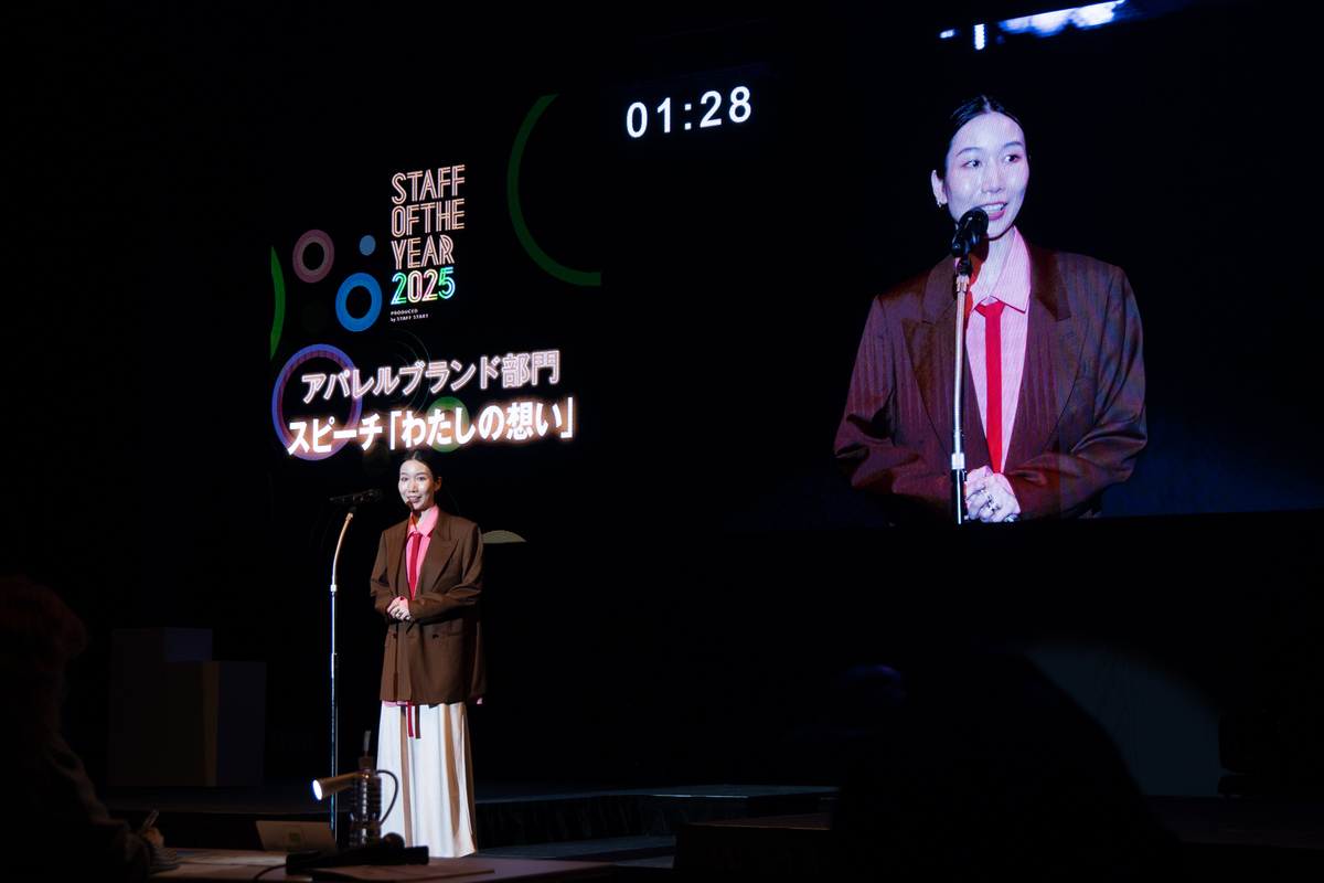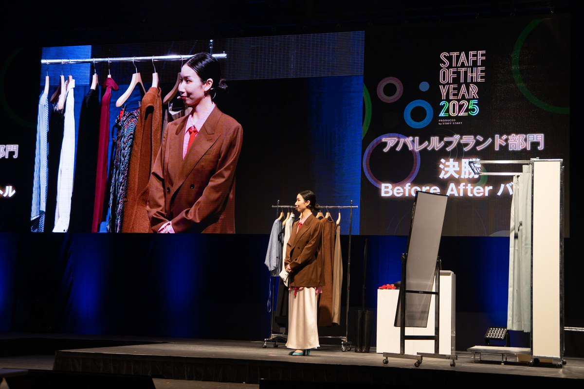 仁藤「渋谷ヒカリエのホールです。全国から14名(アパレル部門12名、物販部門2名)のファイナリストが選ばれ、そこからトーナメント形式で勝ち上がります。お客様のふりをした演者さんがお買い物に来るロールプレイング接客対決、販売員としての想いや理念を語るスピーチ審査、最後は上位1位と2位による8分間のスタイリングバトルがあり、この3つの総合点で優勝者が決まります」