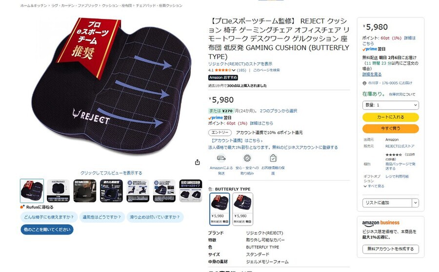 Amazon.co.jpにて、プロeスポーツチーム「REJECT」が監修した「ゲーミングクッション (BUTTERFLY TYPE)」が販売中だ。価格は5980円。