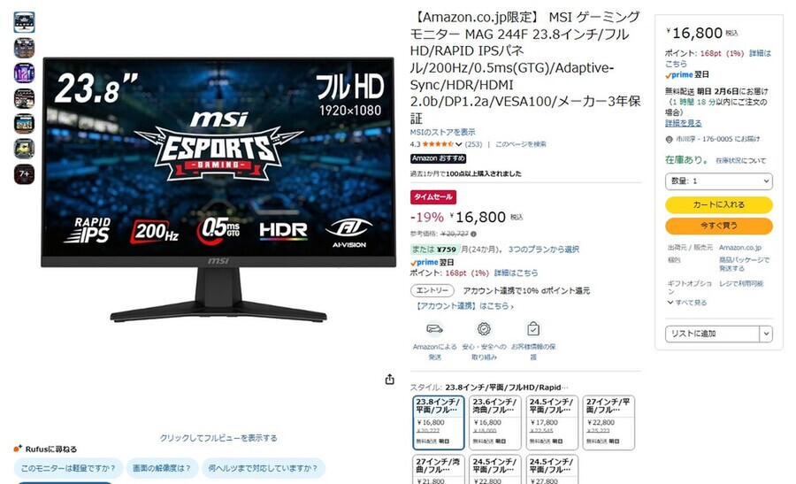 Amazon.co.jpにて、MSIの23.8型フルHDゲーミングディスプレー「MAG 244F」が販売中だ。参考価格は2万722円だが、タイムセールにより19%オフの1万6800円で購入できる(2月5日時点)。