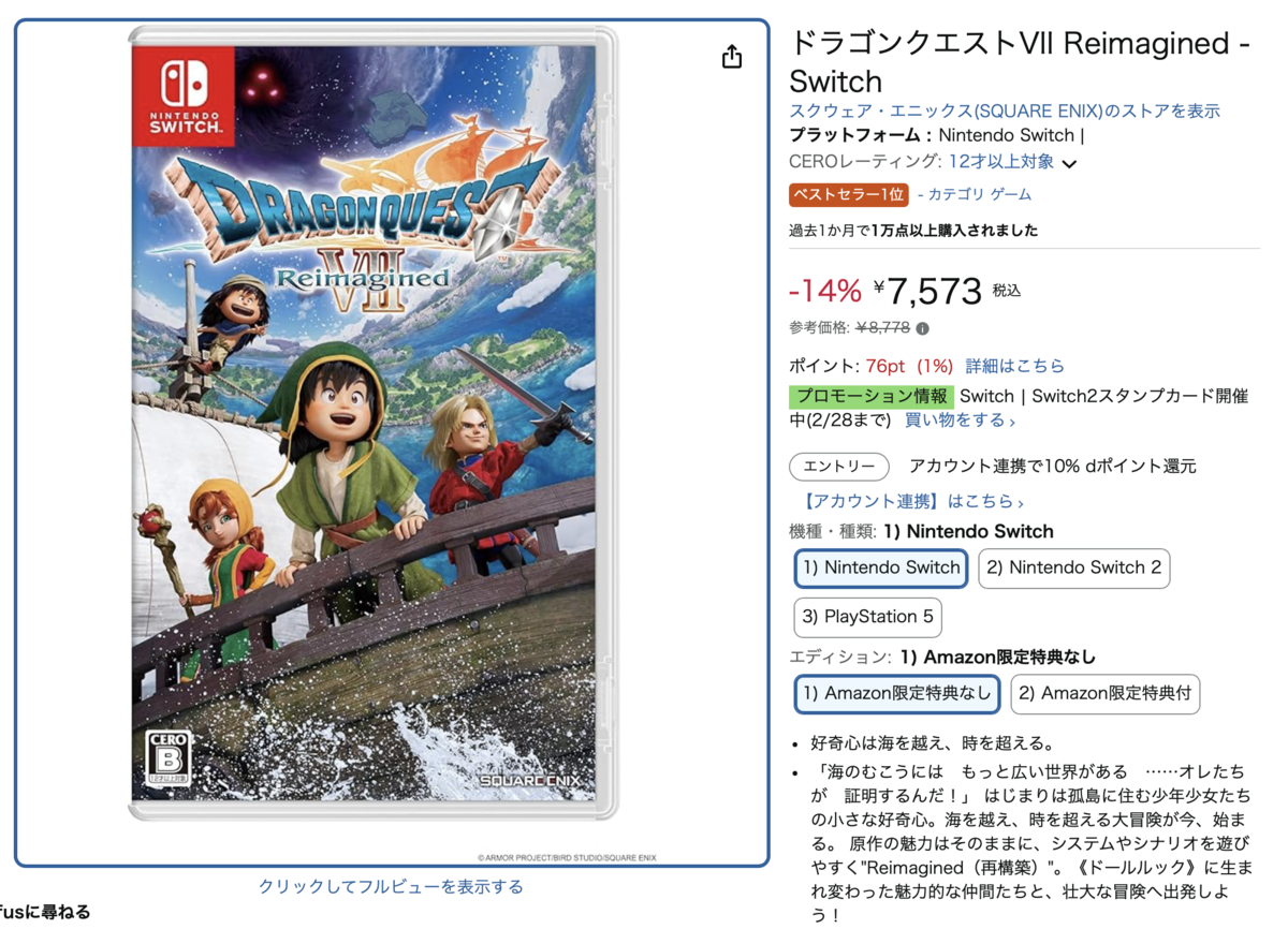 Nintendo Switchの参考価格は8,778円ですが、今なら14%オフの7,573円でAmazonから購入できます(2月5日現在)。