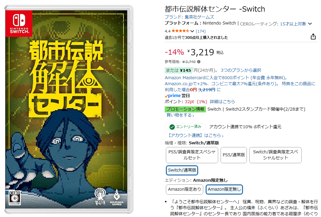 そんな私が今回オススメしたいゲームタイトルは、「都市伝説解体センター」です。パッケージ版の参考価格は3,740円ですが、今なら14%オフの3,219円でAmazonから購入できます。