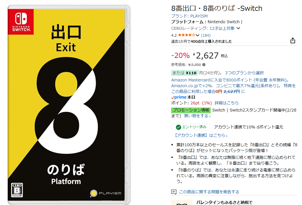 そんな私が今回オススメしたいゲームタイトルは、「8番出口・8番のりば」です。パッケージ版の参考価格は3,300円ですが、今なら20%オフの2,627円でAmazonから購入できます。