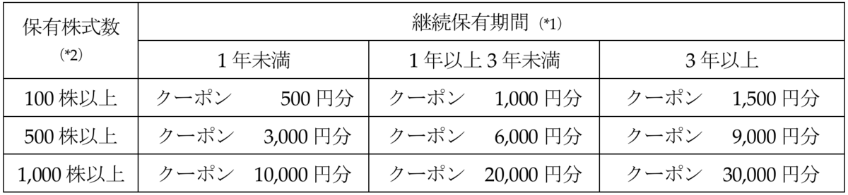 条件を満たした株主には、スクウェア・エニックスが運営するe-STOREで使えるクーポンが付与される。保有株式数と継続保有期間によってクーポンの額は変わり、最低でも100株以上を保有する必要がある。