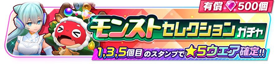 「モンストセレクションガチャ」からはネオ(CV:水瀬いのりさん)、オラゴン(CV:福島潤さん)の2キャラクター、「白猫セレクションガチャ」からソアラ(CV:新井里美さん)、ノア(CV:水瀬いのりさん)の2キャラクターが登場。本ガチャから排出される★5ウェアは、上記のキャラクターのウェアのみとなっている。