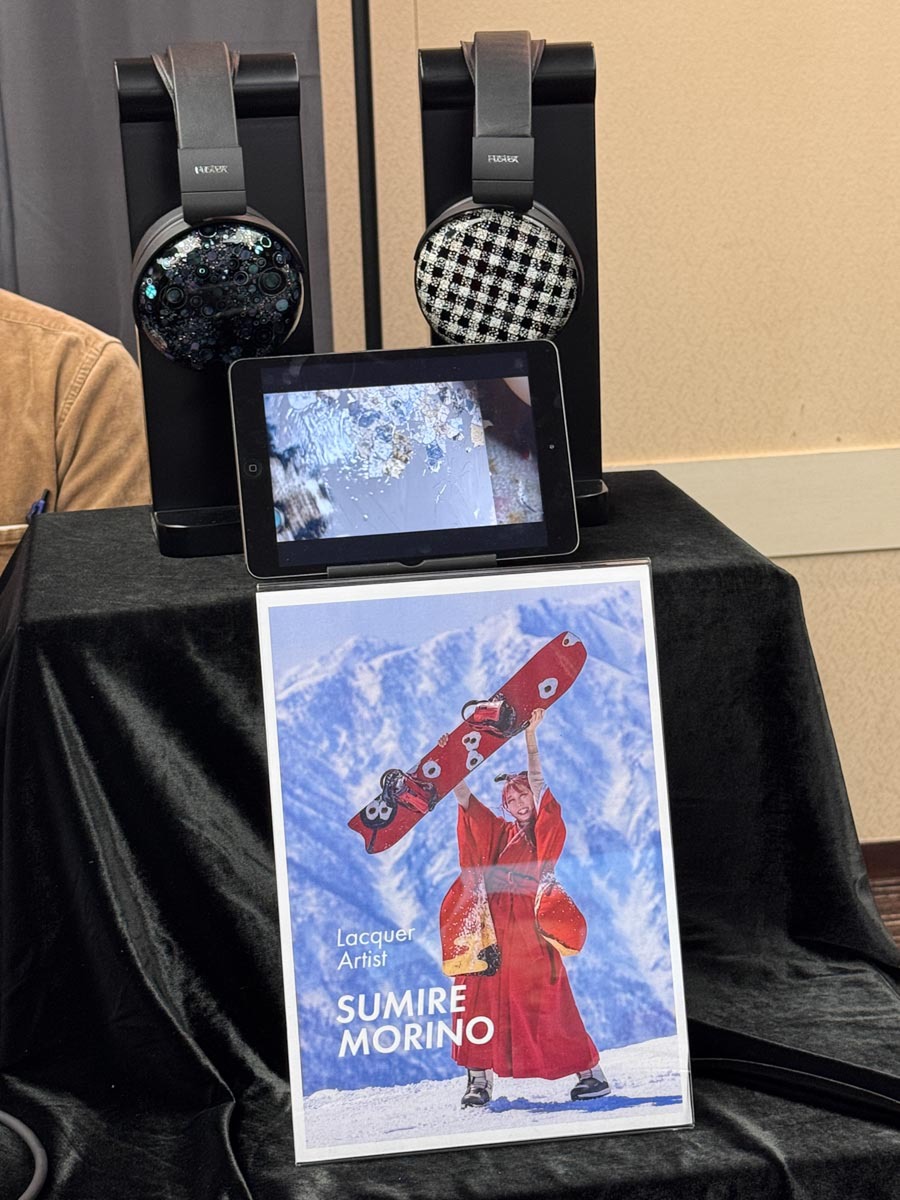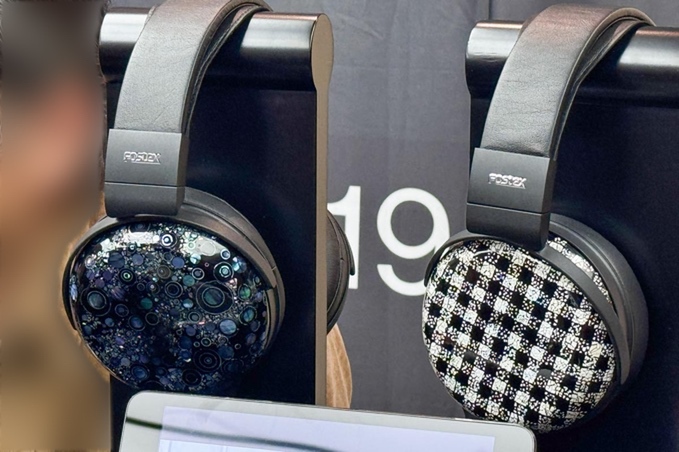 ヘッドホンラインアップを一気に展示していたフォステクス。漆芸作家・杜野菫さんの特別デザインが施された密閉ダイナミック型ヘッドホン「TH910」も目を引いた。「弁慶格子 卵殻敷き詰め」と「螺鈿」の2種類があり、それぞれ江戸時代から続く伝統の文様、夜光貝やアワビ、真珠貝などの貝殻を薄く切って漆地にはめ込む平安時代からの伝統技法だという。