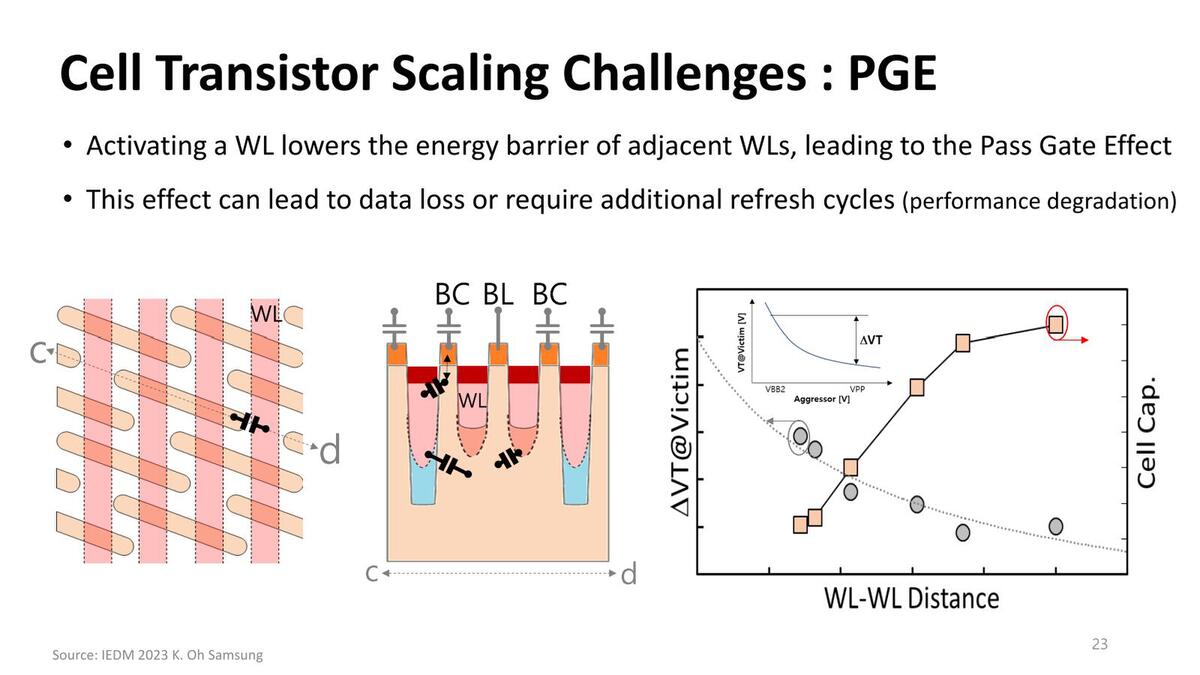 また微細化によりセル同士が隣接することに起因するPGE(Pass Gate Effect)も無視できないことになっている。対処法としてはDRAMのリフレッシュ頻度を高めることが有効だが、リフレッシュ中はDRAMのアクセスができないため性能の低下につながるし、煩雑なリフレッシュは消費電力の増大にもつながることになる。