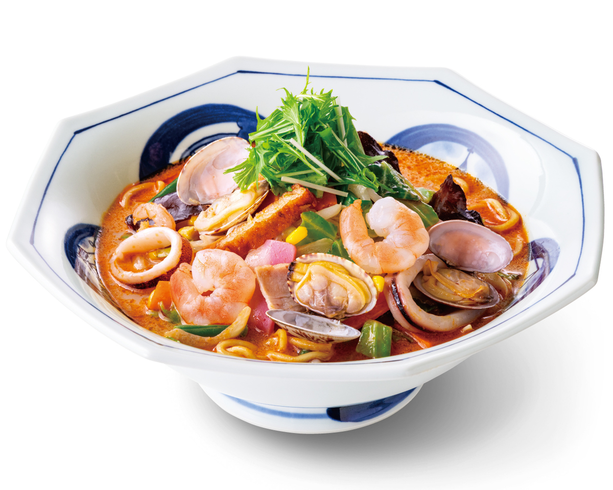 たっぷりの国産野菜を使用したちゃんぽんに、あさり、エビ、マツイカなどを豪華にトッピングし、全15種類の具材と海の幸を味わえる商品。