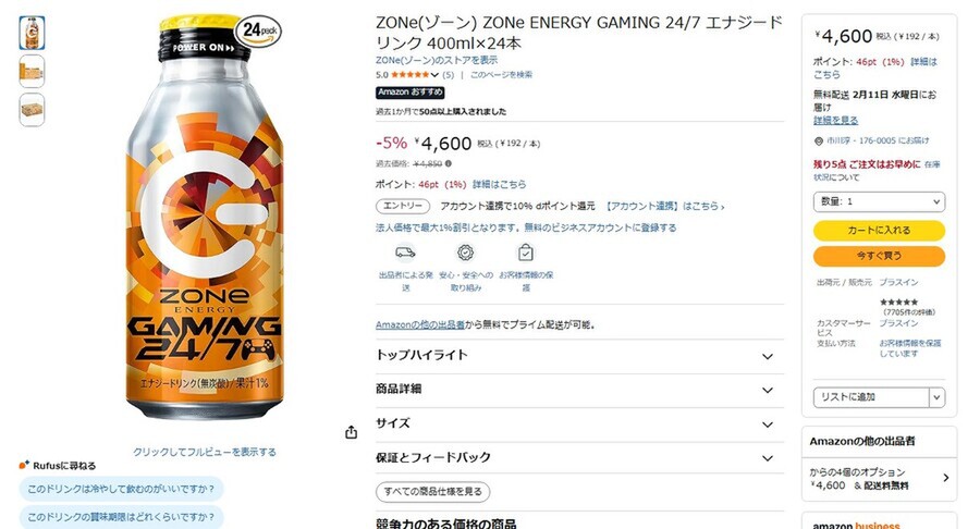 Amazon.co.jpにて、ZONe(ゾーン)の「ZONe ENERGY GAMING 24/7 エナジードリンク 400ml×24本」が販売中だ。参考価格は4850円だが、執筆時点では5%オフの4600円で購入できる(2月9日時点)。