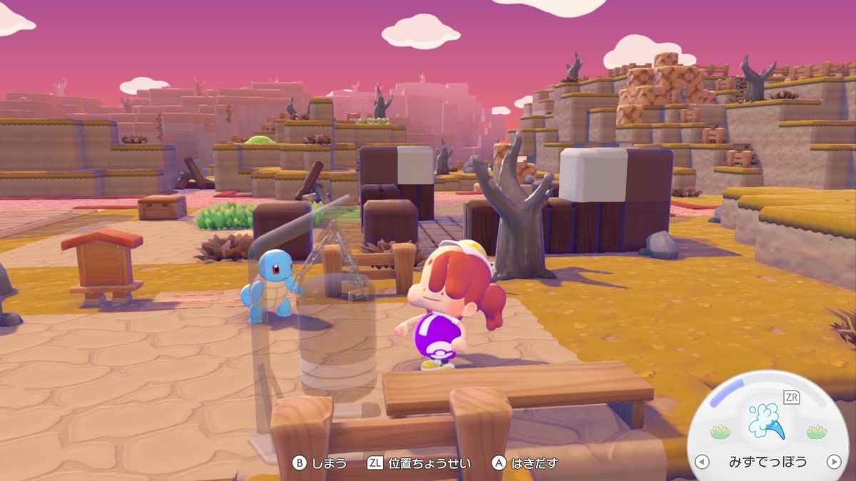 個人的に面白かったのは、ブロックやアイテムを配置する方法だ。PVなどで映像を見ればわかるように、メタモンはニンゲンにへんしんしつつも腕は触手のように細い。アイテムをその腕で持ち上げるのではなく、口の中に「たくわえる」ことで運び、「はきだす」で配置するという方法をとっていた。