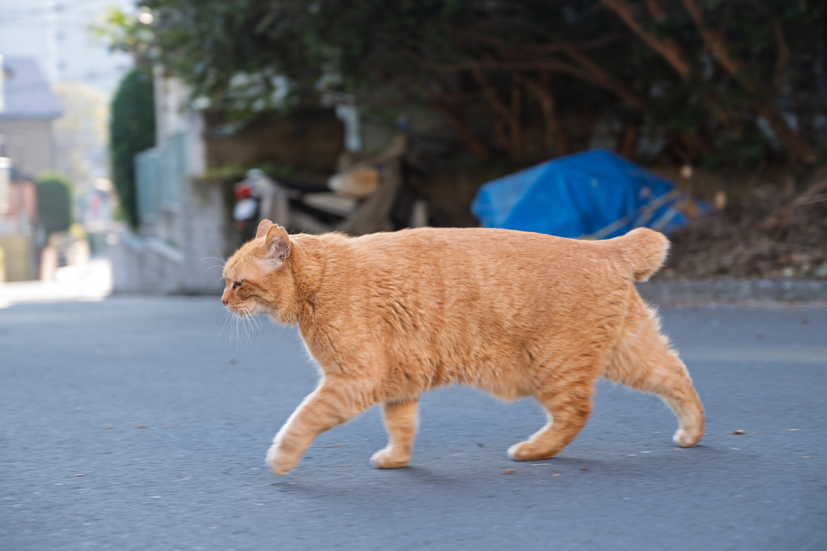 それはともかく、いきなりすすすーっとすぐ横を通り抜けようとするのでしゃがんだまま。おもわず腰を回しながら撮ってたらいい感じの流し撮りの完成である。こういうとき大画面のカメラはいい。猫の高さにカメラを置き、腕ではなく腰を回して撮るのだ。