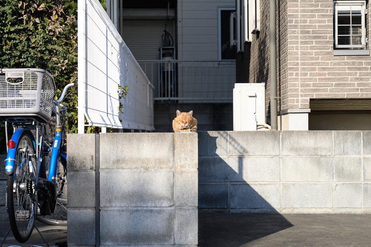 冬の日向猫をもう1枚。低いブロック塀の上にちょこんと座って日向ぼっこしてるチャトラを発見。ブロック塀に対してきれいに真っ直ぐに座ってる上に目を閉じてくつろいでる。しゃがむといい感じの高さに構えられたので、できるだけ真正面から狙ってみた。いい感じに陽射しが当たっててよし。