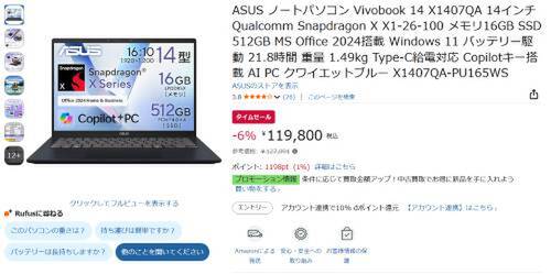 ASUSの14型ノートPC「Vivobook 14 X1407QA」が、Amazonでタイムセール対象になっています。参考価格127,091円のところ、6%オフの119,800円で販売中です。