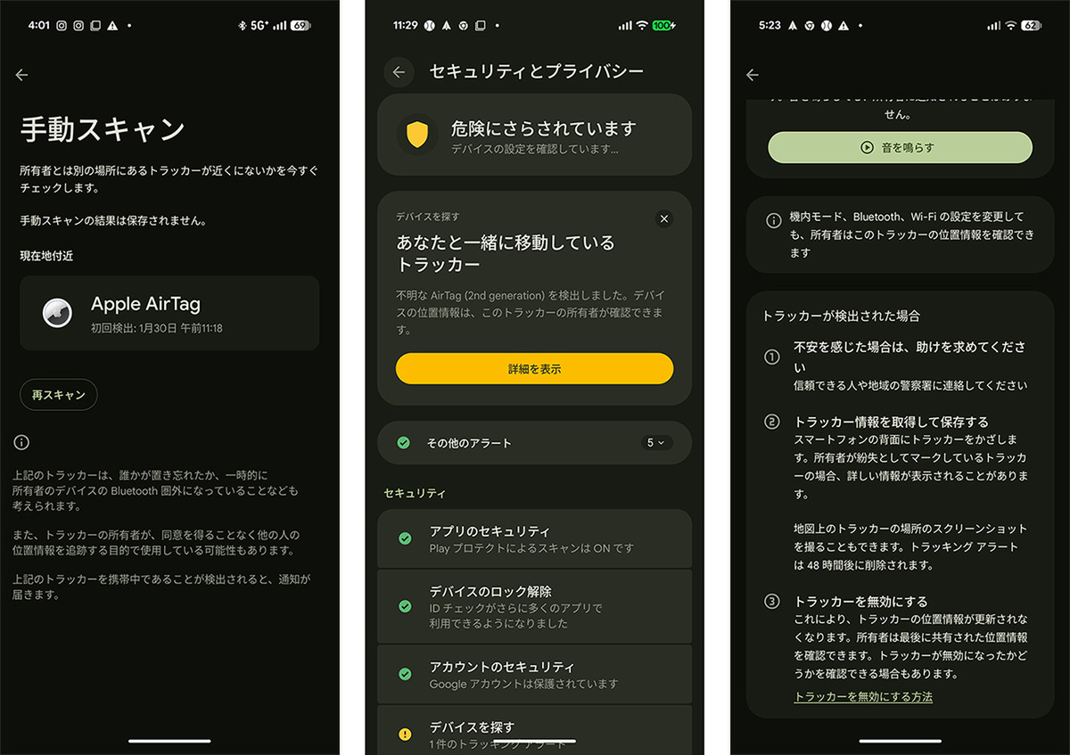 Androidスマホからも身の回りにあるAirTagをスキャニングできます。AndroidデバイスにAppleアカウントを登録できるわけではないので、たとえば自宅などまわりに人がいない場所で探索をかけて、身に覚えがないAirTagが見つかってしまったときに、怪しいAirTagのチャイムを鳴らして場所を特定、個別に対処という形になります