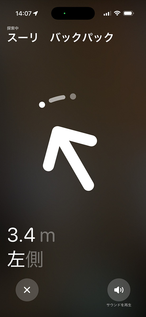 その結果、iPhoneの「探す」アプリから「持ち物を探す」タブを選択して、AirTagを装着したデバイスを「探す」機能を選択すると、現在デバイスがある場所までの距離と、方向を矢印により指し示してくれます。「サウンドを再生」する機能と併用すれば、失いものをかなりスムーズに見つけられる頼もしい機能です。