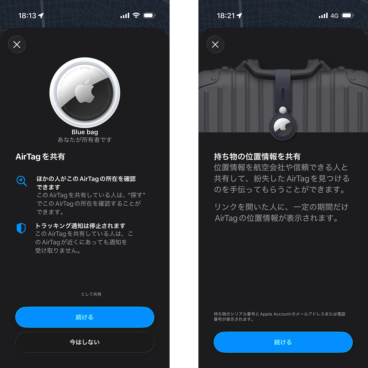 なお、ユーザーが自身のAirTagの位置情報を、信頼できる家族や友人などに「共有」する機能もあります。AirTagを装着した持ち物が紛失した時に、一時的に位置情報を共有して「一緒に探す」こともできます。