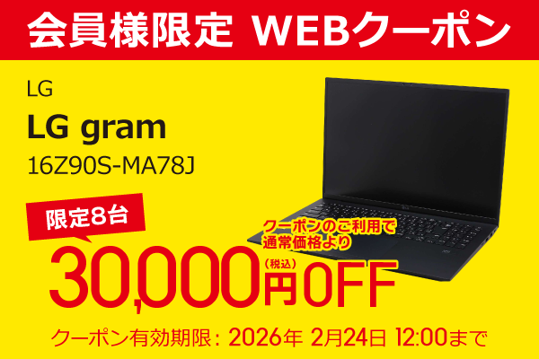 注目の商品は、Core Ultra 7を搭載する「LG gram 16Z90S-MA78J」だ。この商品は通常価格より30,000円引きで購入可能となり、限定8台のみの提供となっている。なお、クーポンの取得にはソフマップEC会員への登録とログインが必要であり、詳細はソフマップの専用ページで確認できる。